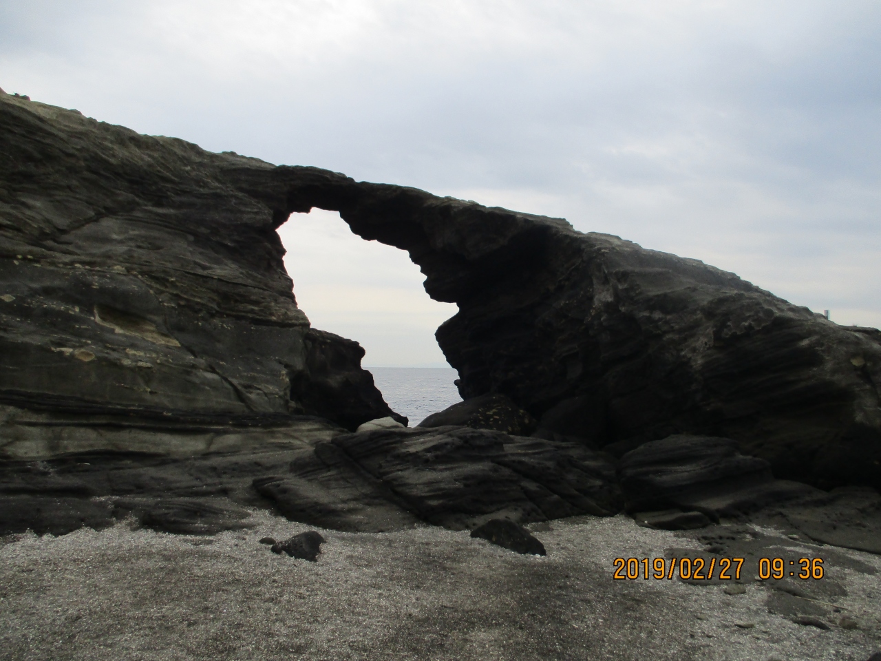 馬の背洞門があります。ポッカリ穴が開いていて面白い岩