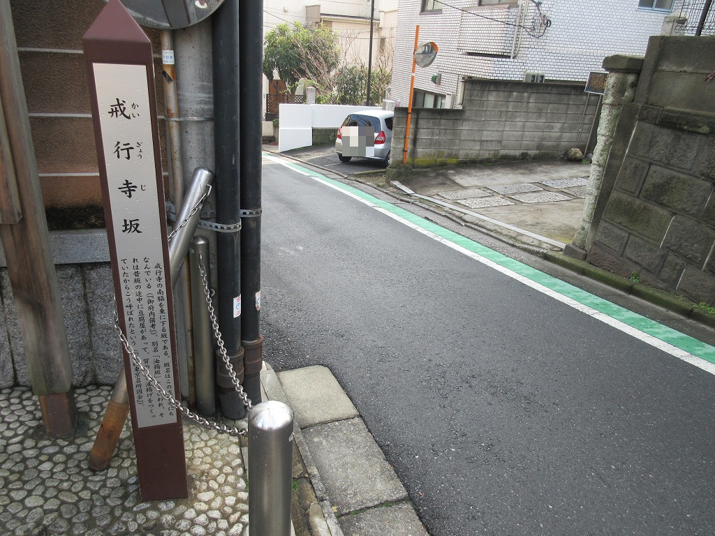 港区の田町や泉岳寺界隈もアップダウンの激しい寺町が残りますが、ここ四谷の須賀町界隈もそれに匹敵するほど坂が多かったですね。その須賀町界隈の寺町を散策した際、日蓮宗の戒行寺に由来する「戒行坂」を上りました。この先の高台には戒行寺ばかりではなく勝興寺など多数の寺院が軒を連ねていて、都会の真ん中にこのような場所があったのかと、大変に驚かされました。