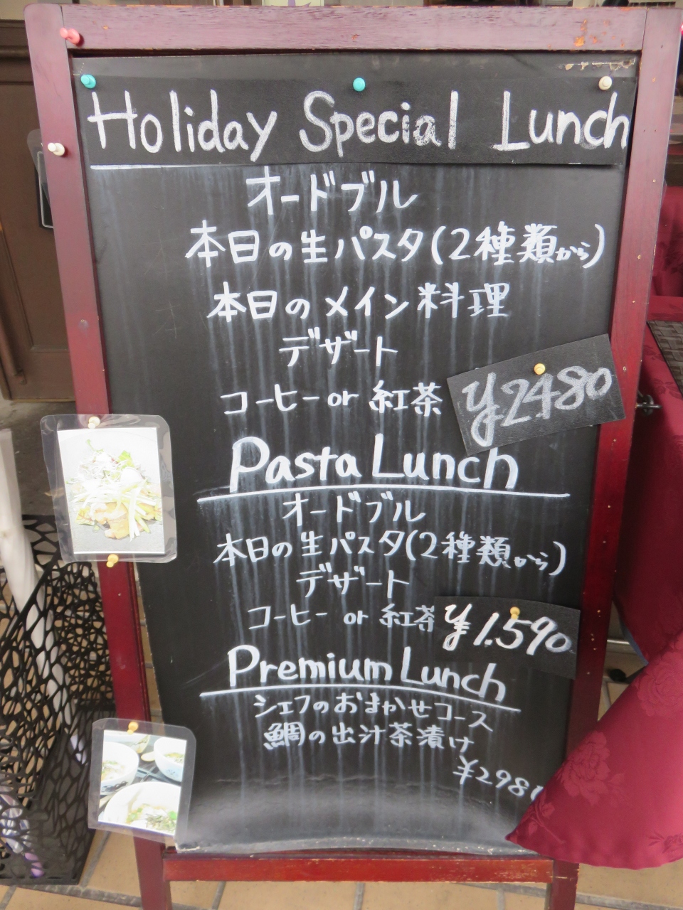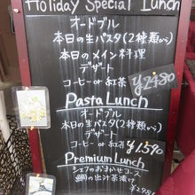 オードブル、本日のもっちり生パスタ(2種類より)、本日のメイン料理、デザート、飲み物(コーヒーor紅茶)となっています