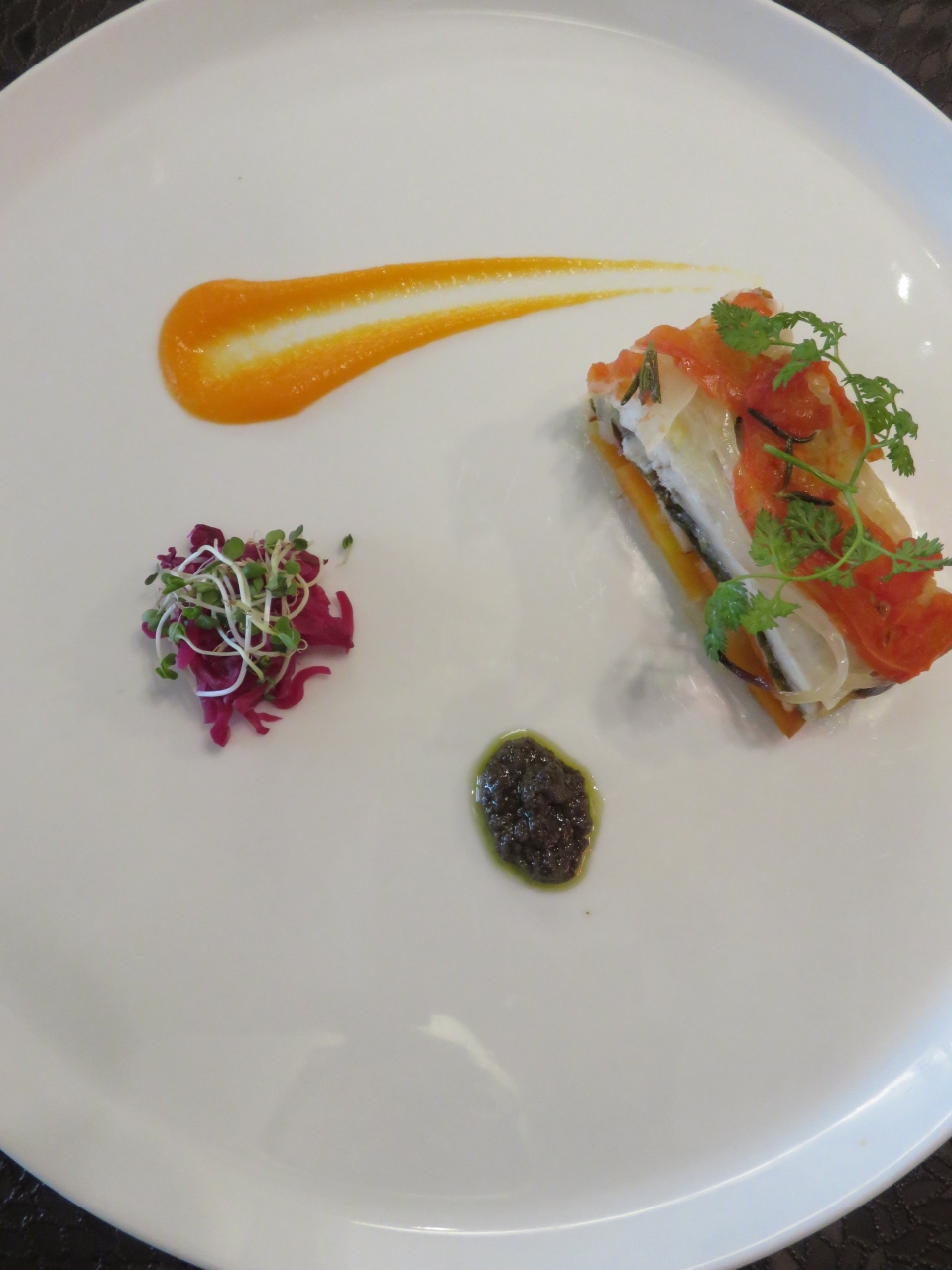 オードブルはミルフィーユ仕立てで何層にも重なりあう素材のハーモニー感じ、添えられたソースと紫キャベツのラテも合わせていただきます