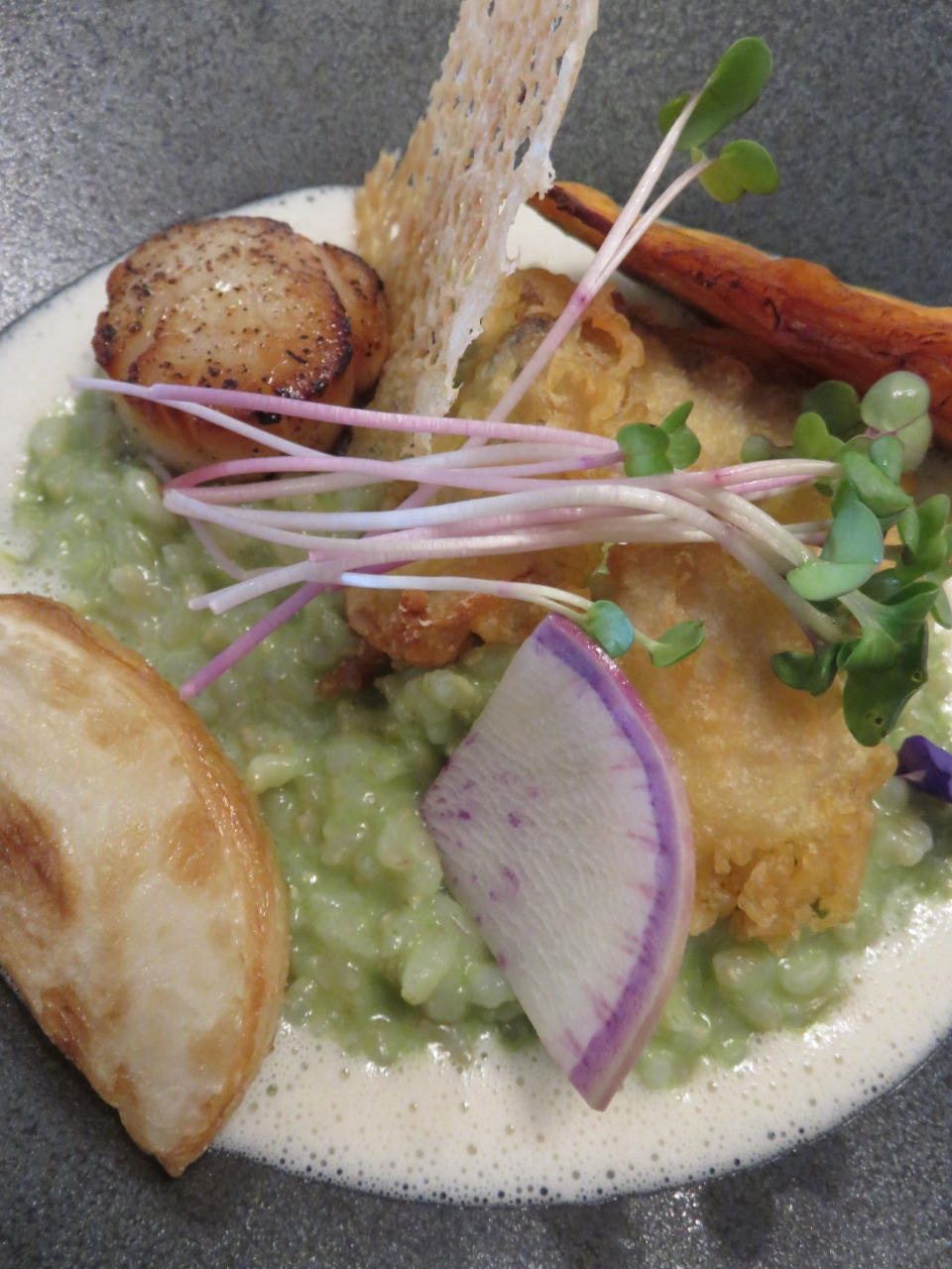 メインはほうれん草のリゾットに白身魚のフライやホタテのソテーが並んだボリュームあるテイスト