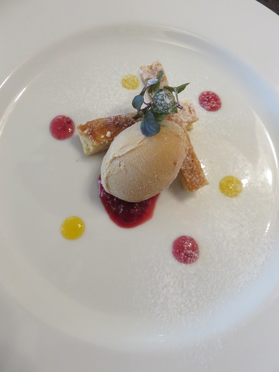 デザートはサクサクなパイとキャラメルアイス、カラフルなソースがポップでおしゃれ