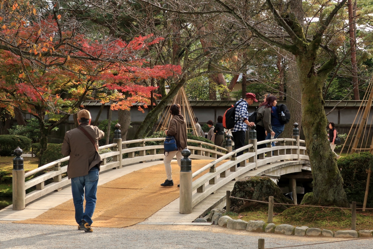 説明版によると、橋から見る季節の花の眺めがすばらしいことから、この名前がついたという。雅なカーブを描く木橋だ。主に桜やカキツバタを観賞する橋だが、青もみじや紅葉も見事だ。橋の下を流れるのは辰巳用水の清流だろう。橋の上から水の流れを愛でるのも、よい。