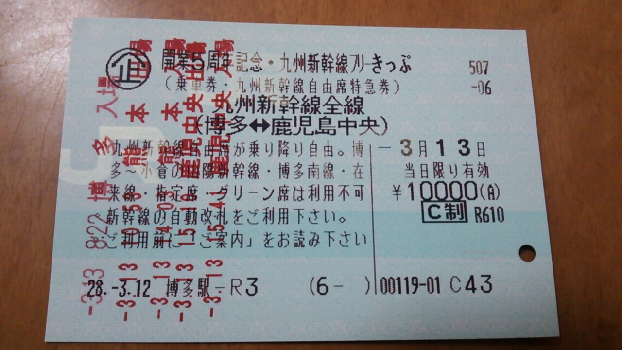 この切符、九州新幹線が全線開通したのが3月の為、その3月の第2日曜日に限り800系・N700系及びみずほ・さくら・つばめを問わず九州新幹線の全ての列車の自由席が1日10000円で利用し放題という切符です。