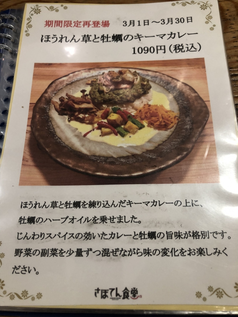 ほうれん草と牡蠣のキーマカレー(1,090円)。