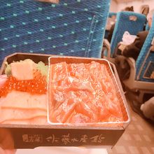 北海道のお弁当を購入したくて佐藤水産でゲット。サーモン尽くしにしました。いくらもサーモンの醤油づけものっててごはんがすすむよ~。あっという間にたべちゃった。おいしくてちょっと感動もの。さすが北海道ですよね。満足や