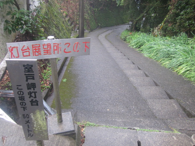 私は雨の日にスカイライン経由で最御崎寺を参詣後、こちらの灯台を目指しましたが、実はこの灯台、最御崎寺よりは低い位置に設置されていて、お寺から最後の箇所は結構急な下り坂を進みます。当然、帰りはそれを登り返さなければならないので、余計に疲れてしまうので、それなりに覚悟が必要です。悪天候時だと、展望もすっきりせず、寒いだけなので、わざわざ灯台まで行く必要もないかもしれませんね。ここに関しては、天気を選んでアクセスされた方が良いかなと思います。