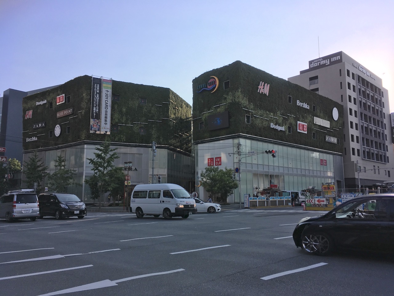 夜になって、天神から博多駅前まで帰る途中に敷地に入ると、噴水のある広場でプロジェクションマッピングのショーが行われていました。