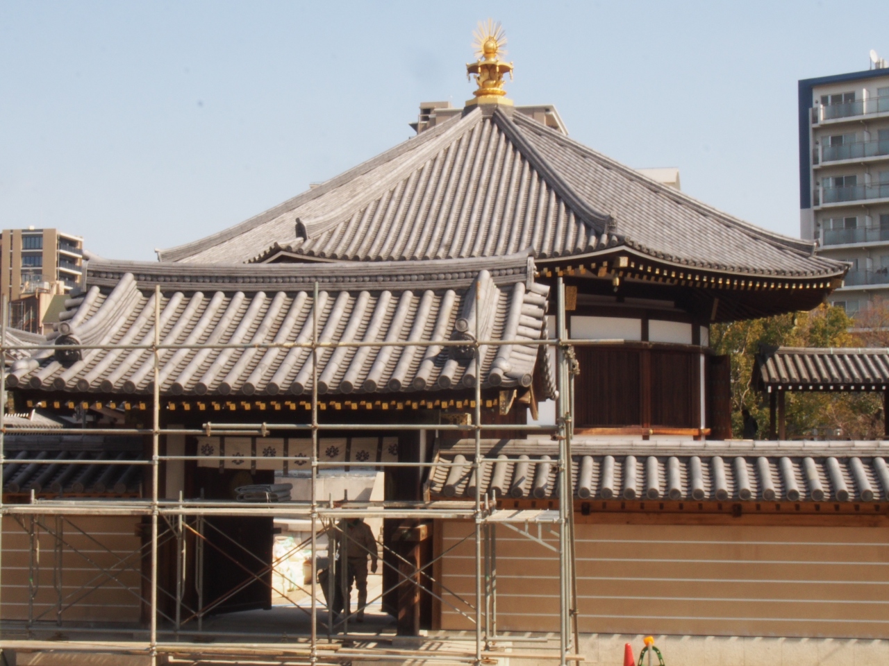 精霊院(太子殿)は四天王寺の境内の東側にある建物です。聖徳太子を祀ったお堂で、太子殿とも呼ばれています。精霊院の境内には工事用の資材などが置かれて、精霊院のお堂も工事用のテントなどが掛けられていて、修復工事中のようでした。なかは立ち入ることができないようでした。精霊院の入り口の門である猫の門が開いていたので、こちらか見ていました。
