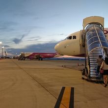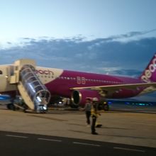 Peachや春秋航空が使用するLCC専用ターミナル。関西空港駅に直結していないので、駅改札口左手のエアロプラザからバスで移動する必要があり、駅直結の第1ターミナル利用に比べて30分程度余裕を見る必要があります。LCCはチェックイン時間に1分でも遅れると搭乗できないと思っておいた方がよいので、特にシーズン時期は、さらに余裕を見た方が良いでしょう。第2ターミナルへの連絡バスは、連接バスになり、また混雑時は増発されるとはいえ、結構、タイムロスします。2017年1月に開業した国際線ターミナルを利用しましたが、平屋建てのプレハブのような建物で、配管や屋根裏がむき出し。LCC専用空港ってこんなものかと感じます。飛行機に乗るボーデングブリッジもなく、飛行機までは徒歩移動。傘は貸してくれますが、雨の日は濡れることは必至。特に夏は厳しいですが、安く飛行機に乗るためとして諦めるしかないです。Peachは早朝便も多いので、早朝から空いているお店は多いのですが、コンビニがセブンイレブン一軒しかないなど、まだまだ改善の余地はあるかもしれない。