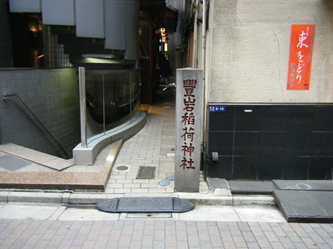 銀座7丁目交差点のそばに「FUKUHARA GINZA」という名前のビルがるのですが、そのビルの入り口に「豊岩稲荷神社」と書かれた石柱が立っています。ですがどう見ても神社らしきものはなく、ビルとビルの間の細い通路を恐る恐る進みます。曲がりくねった細い道を進みます。するとやがてこれまたビルとビルの間の狭い通路にポツンと小さな神社が現れるのですが、ここが豊岩稲荷神社になります。これまで様々な神社仏閣を巡ってきましたが、これはなかなか経験したことがない場所にありました。とても小さな稲荷神社でしたが、どなたか参拝された方がきちんと油揚げを奉納してあるのが印象的でした。