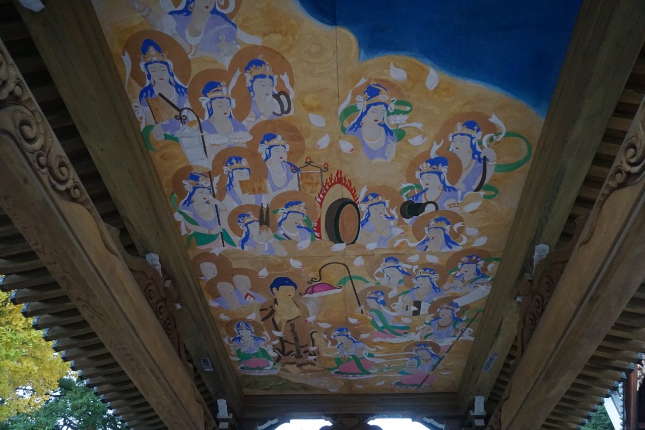 八坂寺は、四国八十八か所霊場の第四十七番札所。駐車場からだと本堂に大師堂はすぐなんですが、その建物はあんまり情緒がないかなあ。それよりも、ちょっとした見どころとなっているのは屋根付き橋のようになった山門。本堂から下った下の方です。天井に22の菩薩と阿弥陀如来が彩色で描かれていて、けっこう心が和みます。