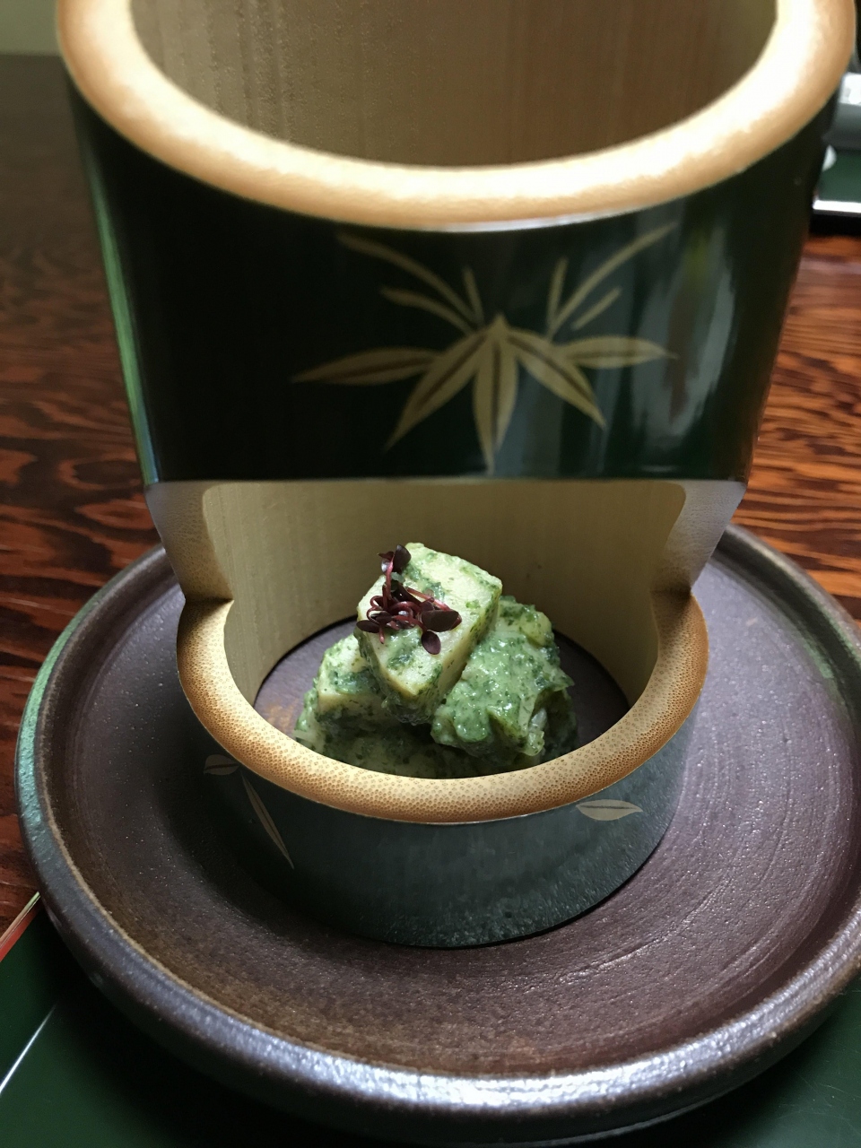 4月の筍の季節に合わせて、たけのこ料理をいただきました。京都駅から30分ほどバスに乗り、バス停から15分ほど歩いて、お店に着きました。アクセスがちょっと不便ですが、その分、以前訪れたことのある、春の筍料理で有名な錦水亭と比べると、人声が少なく、落ち着いた雰囲気。お店の裏山で、お店用の筍を作っている竹やぶがあり、その周りを散策してから、料理をいただくと、手間暇をかけた味わいをより一層美味しくなります。