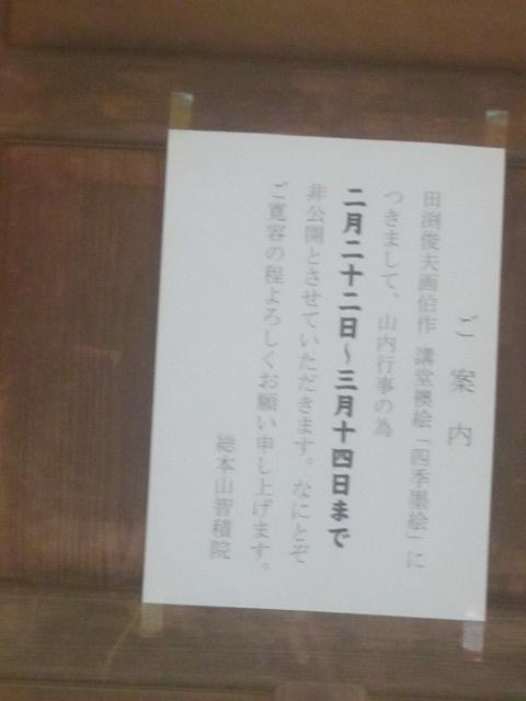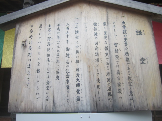 智積院のメインの見所の一つはこの講堂で、回廊上の通路に沿って外周を歩けるようになっています。ここから有名な庭園も眺めることが出来ますが、庭園も見る角度によって風情も異なりますので、やはり億劫がらずにゆっくりと歩いて周回しておくと良い建物だと思います。因みに普段は襖絵も有名なのですが、私の訪問時は何かのイベントで”出張中”だったようで、それが見られなかったのは少々残念でした。