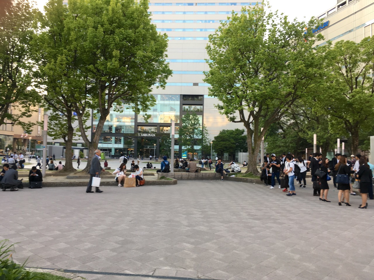 神社とプラザの間にある広場のような場所で、ビルの谷間にあって緑が目に優しい公園です。