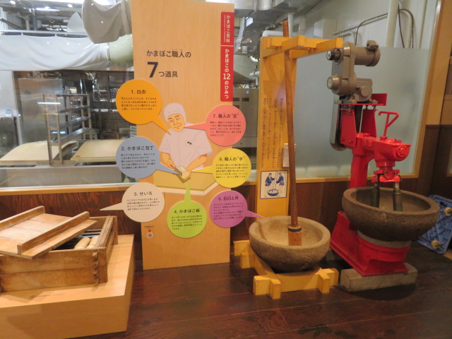 1階では製造過程が見られます、過去に製造過程で活躍した機械等が展示されています、蒲鉾グッズの販売もあります、蒲鉾・ちくわの手作り体験が出来る場所もあります、2階はかまぼこ板絵美術館があり作品を見ることが出来ます、3階は食と科学のコーナーがあり、蒲鉾のおいしさを知ることができます、子供から大人まで楽しめる施設です。