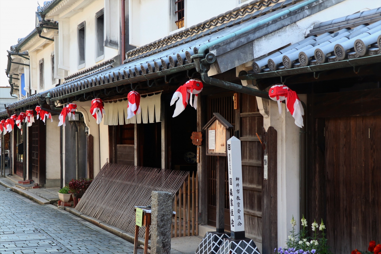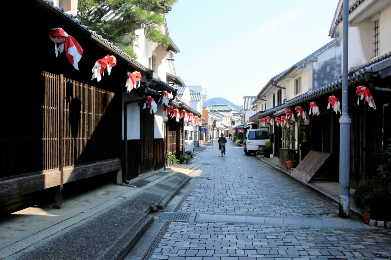 岩国へ錦帯橋を見に行った際、柳井も訪れました。やない駅から10分ほど歩くと、約200m続く小路の両側に江戸時代の商家の白い家並みが続いています。中世からの町割りがそのまま残っているそうで、私たちが行った時は人の姿もほとんどなく、まるで映画のセットの中にいるような感じでした。白壁の家のいくつかはコーヒーショップや土産物屋になっていて、そぞろ歩きが楽しめます。各家々の軒下にはユーモラスな顔をした赤い「金魚ちょうちん」が吊るされ、情緒ある風景に彩りを添えていました。岩国からちょっと足を延ばしたことで、思わぬタイムスリップができました。