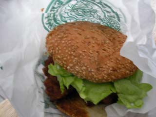 函館駅の駅前の市電の通りにある地元のデパートの棒二森屋の裏にまわると派手な看板の函館駅前店があり、函館ローカルのハンバーガーを売っています。一番人気のチャイニーズチキンバーガーに目玉焼き付の竹を注文すると朝早く空いていて、すぐに出来上がり、ゴマの乗ったバンズに甘辛味のソースのかかった唐上げ挟まっていて、食べ応えがあります。