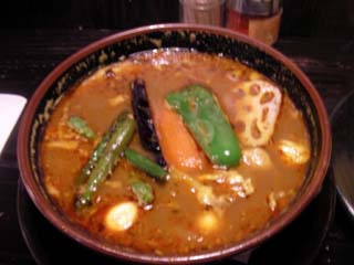 メニューを見ると苫小牧店や札幌中央店で食べたのと同じスープカレーのメニューで、まだ食べていないポークをスープ大盛、ライスMサイズ、辛さ5番で注文します。店内は仏像などインドネシアの調度品を使った内装で、ポークはスープの量と、野菜の豊富さは同じですが、5番でも辛さは北海道仕様よりないので、卓上のチリペッパーで辛さを増量し、中から柔らかい豚の角似が沢山入っていて美味で、北海道まで行かなくても本場の味を楽しめる店です。