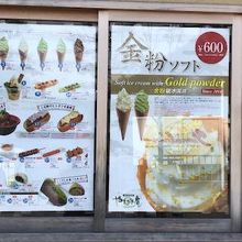 食べ物を売っている売店です。金閣寺の敷地の中にもいくつかありましたが、ここが一番よさそうでよりました。駐車場に近いので便利でわかりやすい場所なのがいいと思いました。ほんのり金箔がのっているソフトクリームもよかったです。