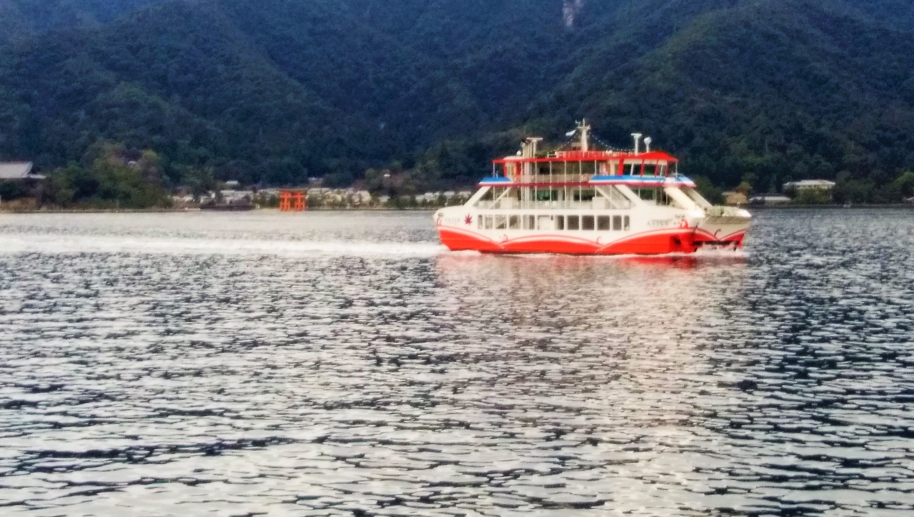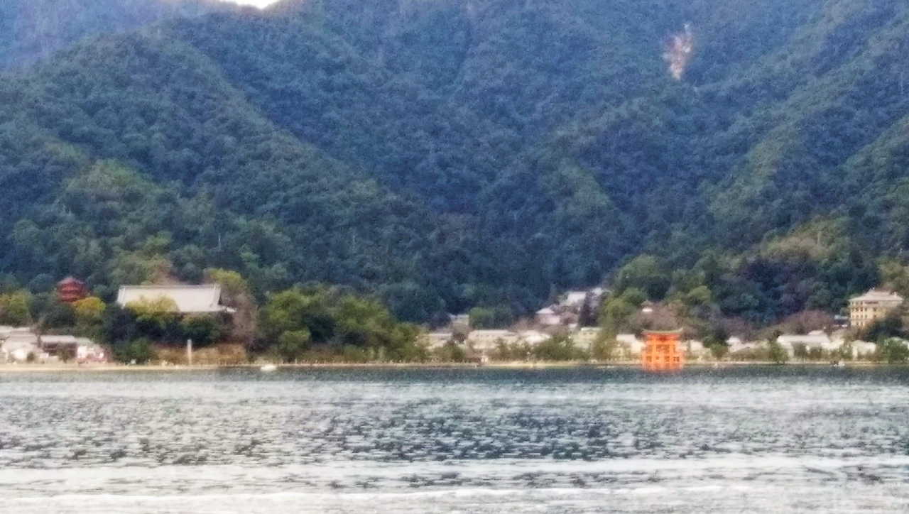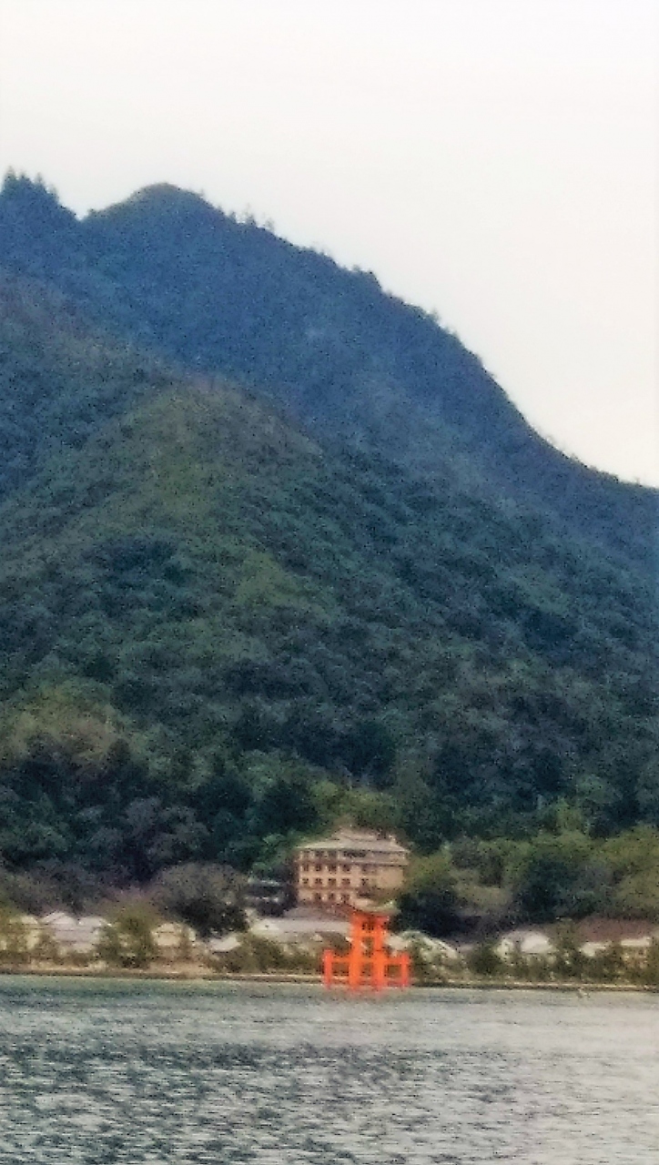 広電に乗って宮島口に着きましたが、フェリー船で往復だけにしました(今回は時間の関係で宮島上陸は無しです)。海(大野瀬戸)から嚴島神社の大鳥居を!;乗船しました。特に帰りの便は、大鳥居はもちろんですが、五重塔/千畳閣/拝殿//が遠目ですが、でもハッキリと拝見できました♪ それに`弥山`が大きく見えましたよ。 一枚の写真で大鳥居と五重塔が撮れるなんて(^^)