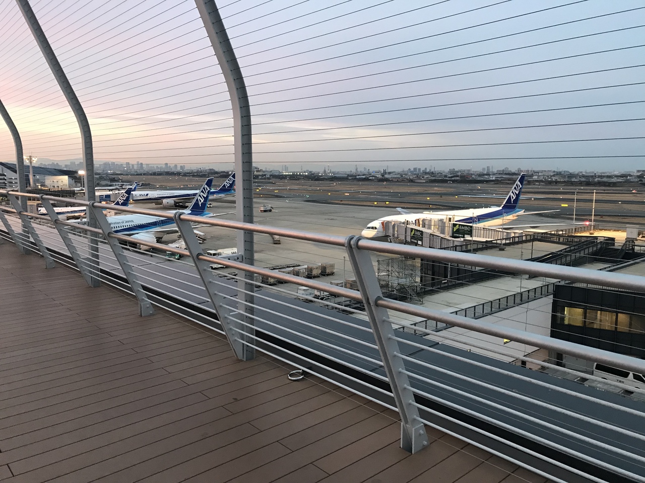 大阪国際空港(伊丹空港)展望デッキ「ラ・ソーラ」からは、向かって左側にANAの機材が、向かって右側にJALの機材が集まっており、なかなか壮観です。