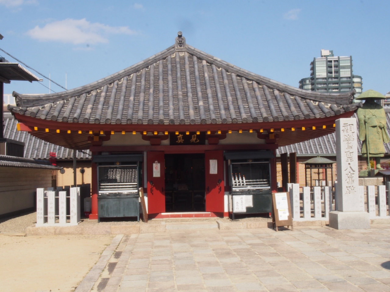 四天王寺の西側の入り口である石鳥居をくぐり、極楽門へと歩いていくと、極楽門のすぐ手前の左側に見えるお堂です。お堂自体はこじんまりとしたものです。浄土真宗をひらいた親鸞聖人を祀ったお堂ということです。お堂の横の敷地には親鸞聖人の立像がありました。石鳥居を入ってすぐのお堂なので、みんなの注目を浴びているようでした。