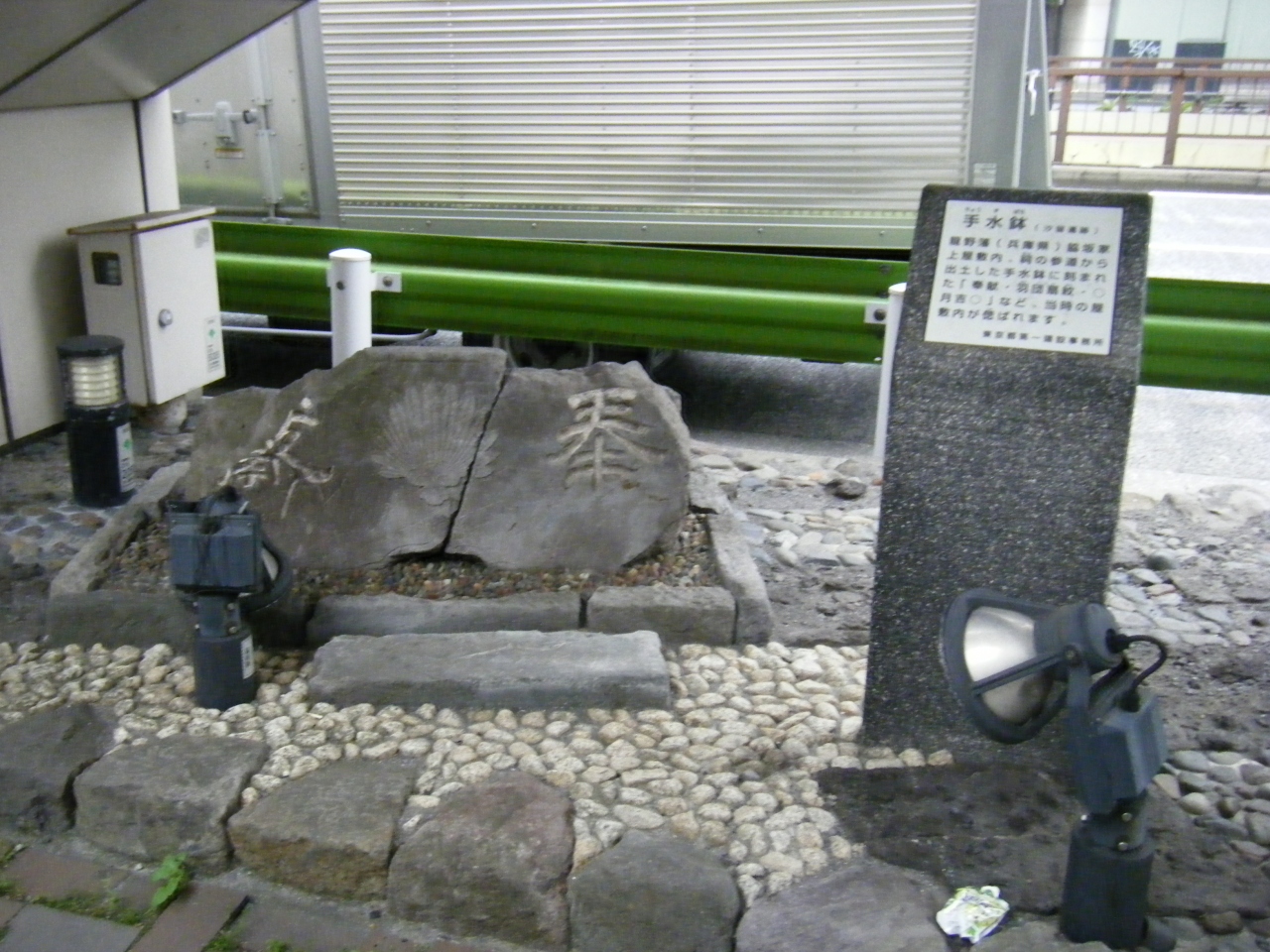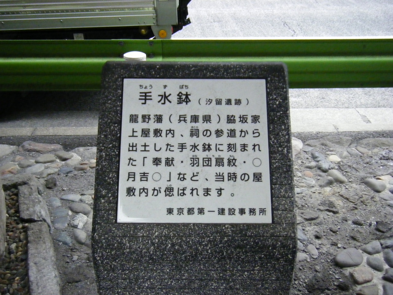 銀座東7丁目交差点の歩道橋下にいくつか史跡が残されていますが、そのうちの一つがこの手水鉢になります。真っ二つに割れている上、いたるところが欠けていますが、この手水鉢は龍野藩(現在の兵庫県)の脇坂家の祠から出土したもので、当時の屋敷内が偲ばれる文字も彫られているようです。ちょっとボロボロすぎるのが残念ではありますが、とても歴史のある手水鉢という事がわかりました。