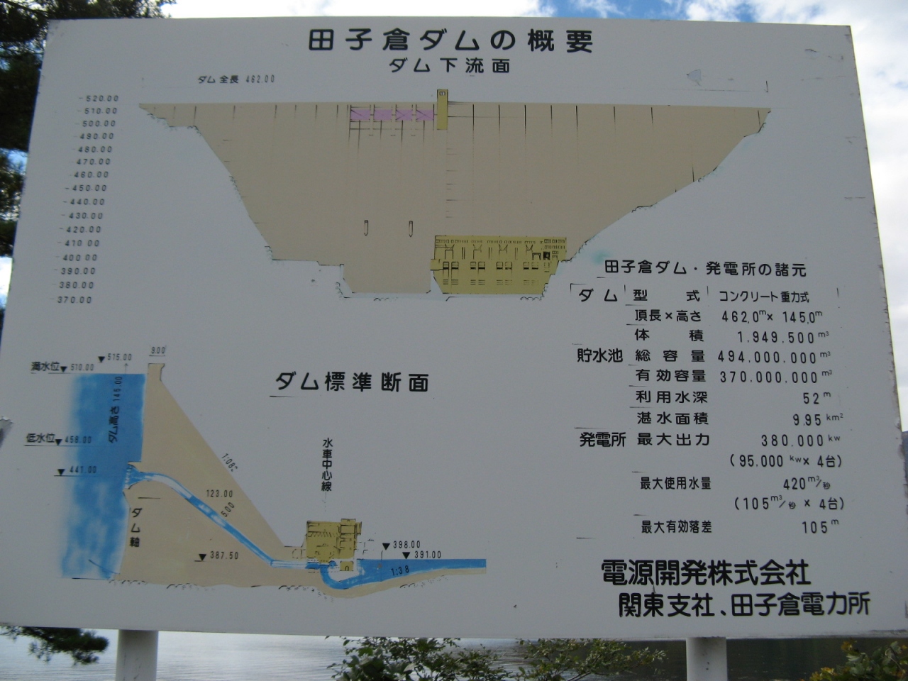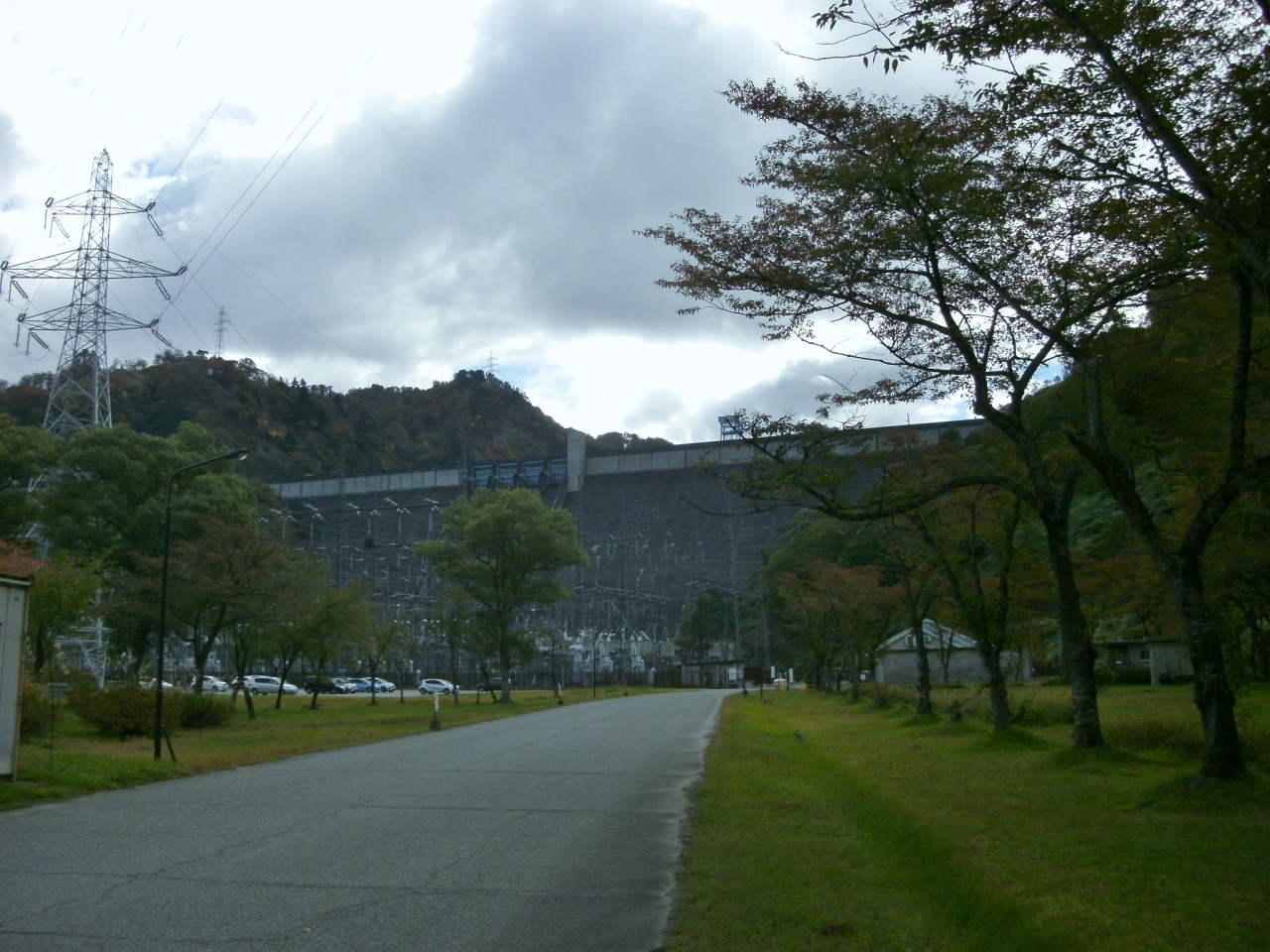 重力式コンクリートダムとしては堤高が全国第六位、総貯水容量は全国第三位という大きなダムで、ダム直下にある発電所施設付近から観ると目の前に迫る巨大なコンクリートの壁を堪能することができて迫力満点です。堤頂部は中ほどまで歩行者のみ見学可能で、中央近辺に巨大なメンテナンス用のクレーンが目を引きます。堤頂部からの景色も素晴らしく、巨大なダム湖と、広く開けた下流側の先には只見ダムが見えます。