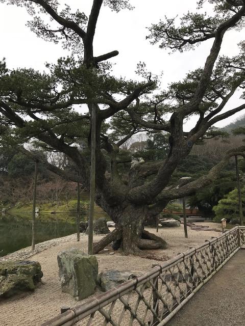 日本庭園には松がよく似合い、他の名園にもたくさんの銘木がありますが、ここ栗林公園の松の中で一番の松はこの五葉松でしょう。掬月亭の近くに生えています。根元から5本の木が分かれたように見える松で、五葉というよりも五木という感じの立派な松の木でした。