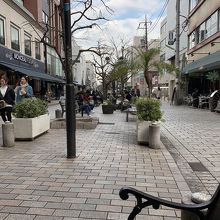 左右の道の端にお店がいっぱいあるおしゃれな通り。