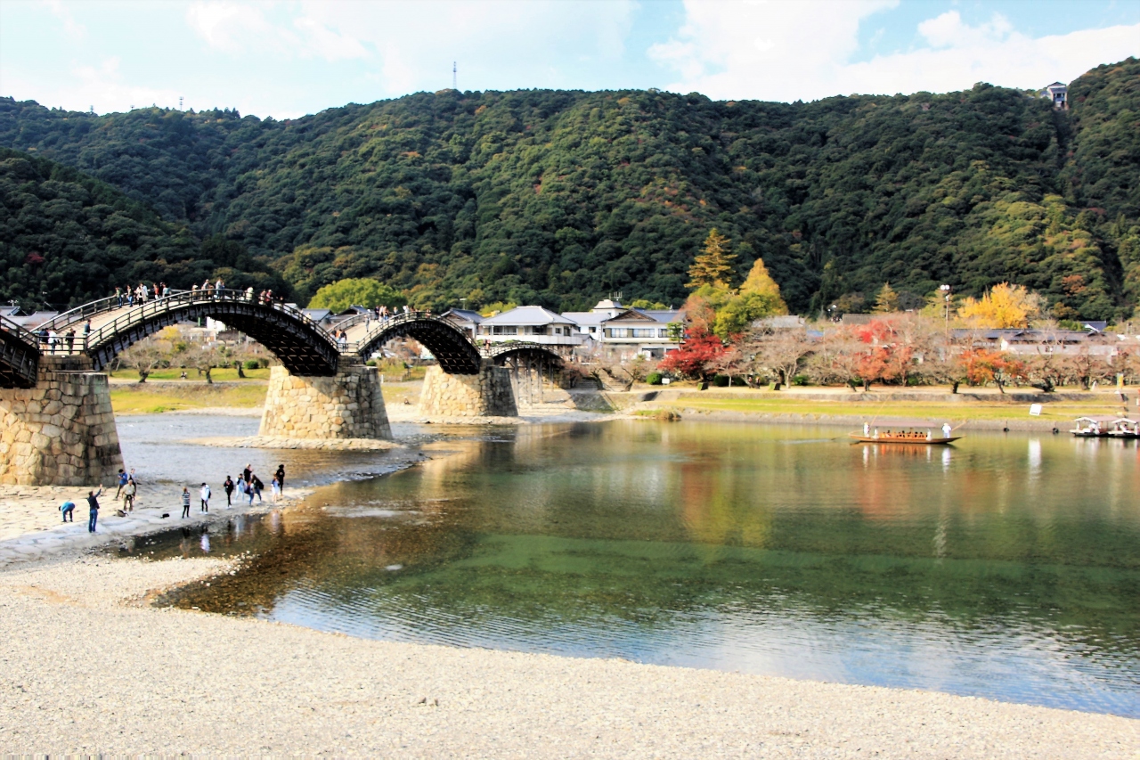 アーチ型の橋を渡る際は、階段部分の段差と幅が微妙に異なるので、よそ見をしてつまづかないよう注意が必要です。が、橋の下を流れる錦川も美しいので、是非立ち止まって橋からの風景も楽しんでください。