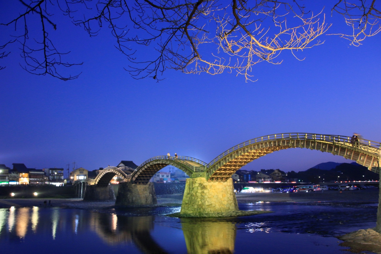 5連のアーチからなる木造橋、この橋と周りの自然が創り出す美しい風景に魅せられて、季節や時間を変えて何回も写真を撮りに行きました。桜や紅葉と橋のコラボはとてもフォトジェニック。夕景に浮かぶシルエットやライトアップも幻想的です。