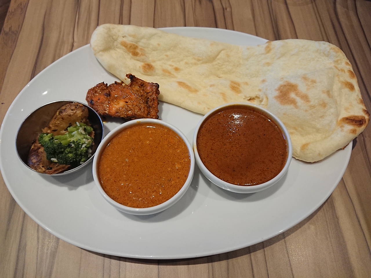 注文したランチセットは、何種類かあるカレーの中から2種類選べ、ナンとタンドリーチキン、ブロッコリーとじゃがいものグリルが付いていました。