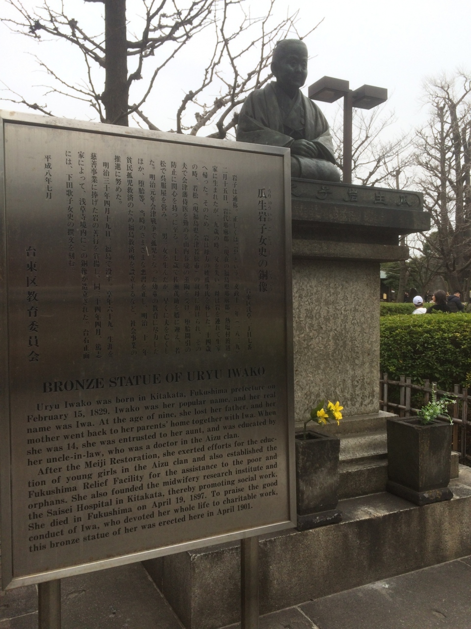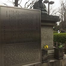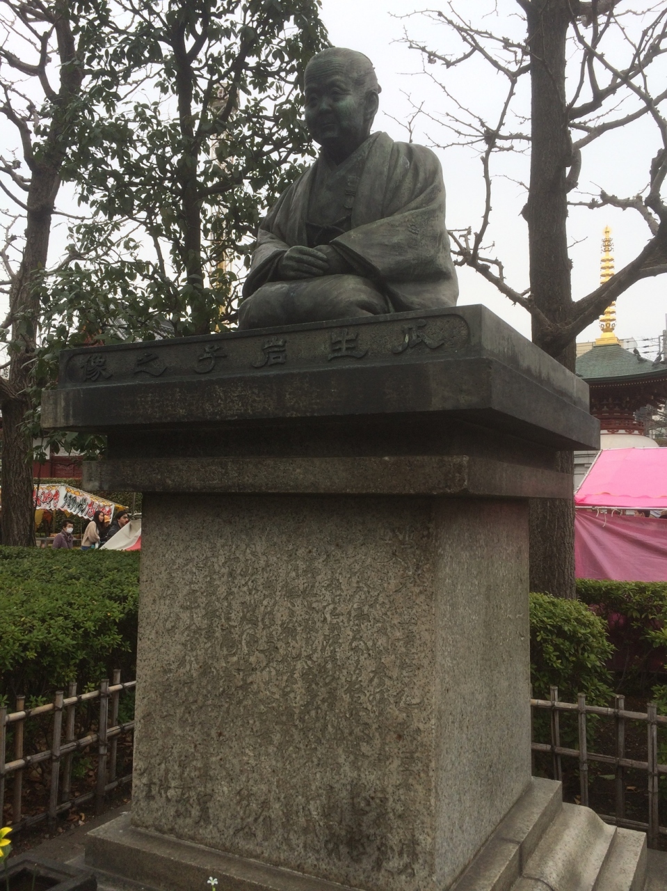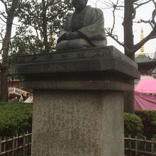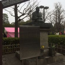少し高い位置にある正座をした銅像で本物の人のように見え、良くできた像でした。新奥山というエリアの入口にあるので目立つ像でした。初めて知った人でしたが説明看板が日本語のほか英語もありました。着物を着ている姿が良かったです。