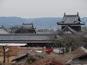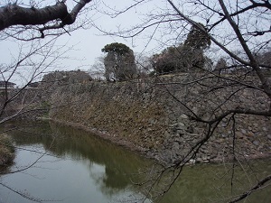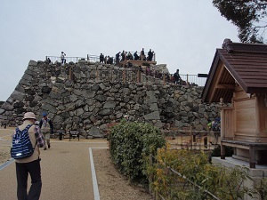 10世紀郡山衆が築城したのが始まりで、その後筒井氏、豊臣秀長、本多氏、松平氏、柳沢吉里、吉里以降は柳沢氏の居城となる。明治維新の廃城令で廃城になる。建造物は明治時代に売却され、遺構は堀と石垣を残すのみです。天守台からは石垣と掘り、追手門、追手向櫓等が見下ろせます。天守台近くに柳沢神社が建っており、本殿の銅板葺きの屋根の色と曲がりはきれいでした。本日のハイク目的が大和三城巡りであったが、前半二城は看板のみでがっかりしていました。さすが本城は、名だたる武将達の居城だけあって見事な城だと感嘆しました