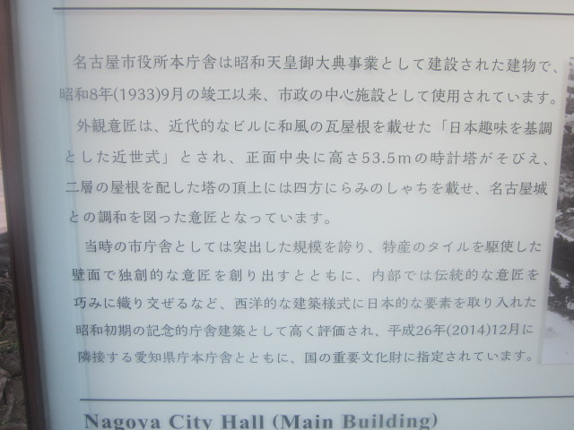 但し、勿論、市役所という建物の機能上、そんなに派手にする訳にはいきませんので、金鯱ではありませんが、最頂部の彫刻をズームして見てみると、しっかりと四方を睨む姿の鯱の姿になっています。建物自体、2014年になって漸く重要文化財に指定されたばかり、というのは、ちょっと意外な気がしますが、やはり名古屋に来た以上は、お城と共に、この昔ながらの市庁舎建築は見ておいて損はないかと思います。