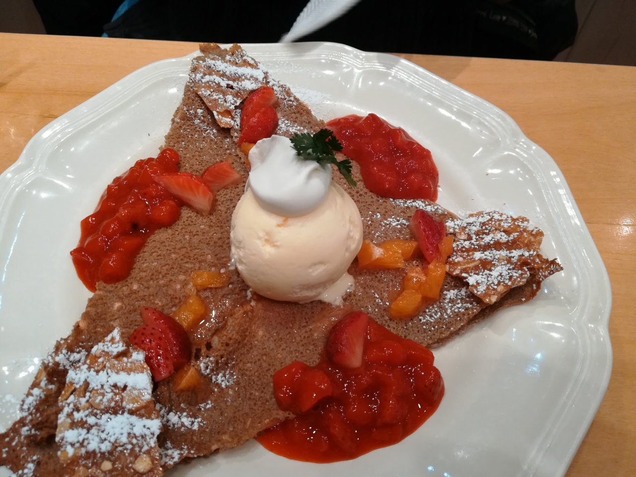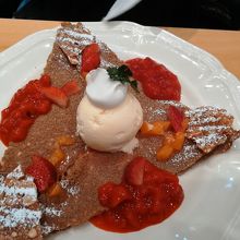 お昼が少なめだったので、少し軽いものを食べようとしたらちょうどガレットがありました。苺なので季節限定なのだと思いますが、アイスと苺ジャムなど添えられていて美味しかったです。生地もモチモチしていました。