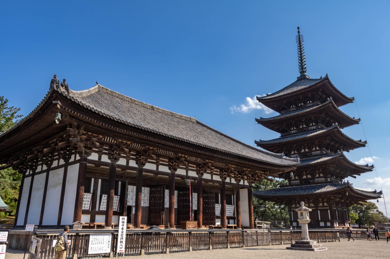 五重塔で有名な興福寺、宝物館や東金堂を除いて見学は自由なので、人の少ない早朝やライトアップされた夜に訪れるのがオススメです。五重塔のベストスポットは坂を下りたところにある猿沢池。宝物殿では有名な仏塔を見逃さないようにしましょう。