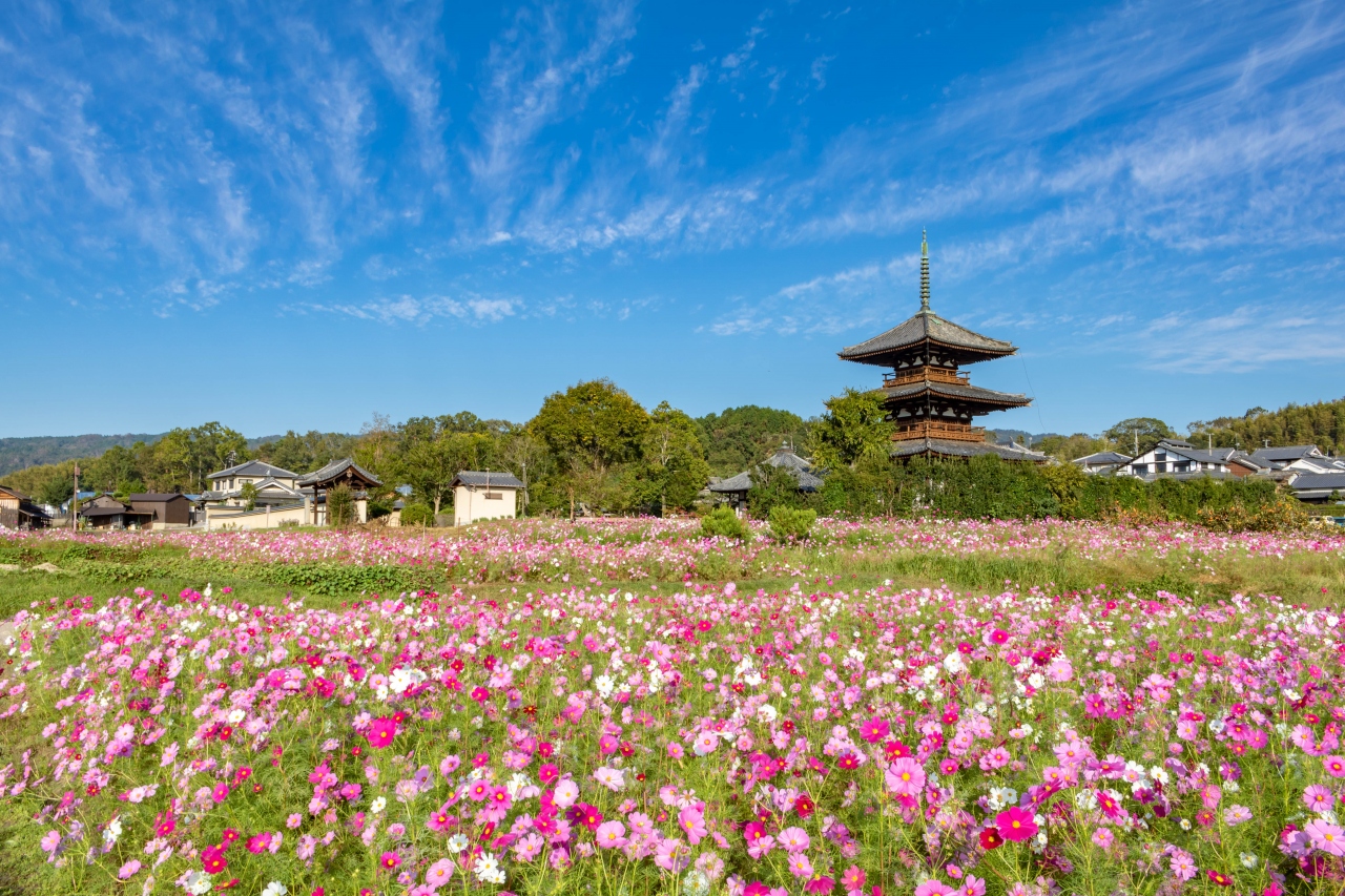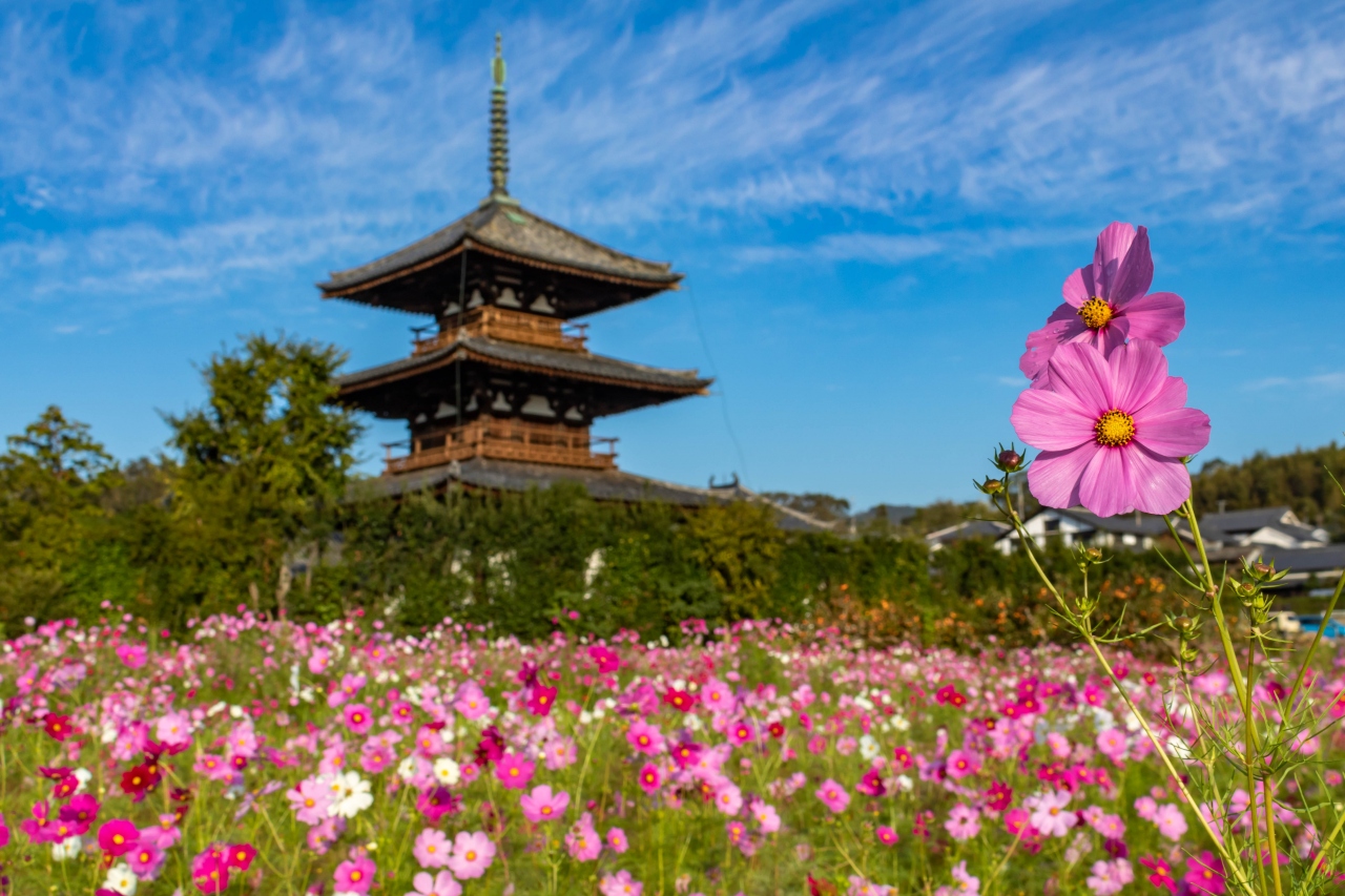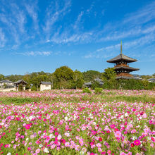 有名なコスモスを見に訪れました。駅からは少し遠いですが、25分ほどなので何とか歩けます。夕日とコスモスが有名ですが、なんだかんだで晴れた日の朝の順光の中に見える法起寺が一番美しいと感じました。もちろん夕陽も絶景です