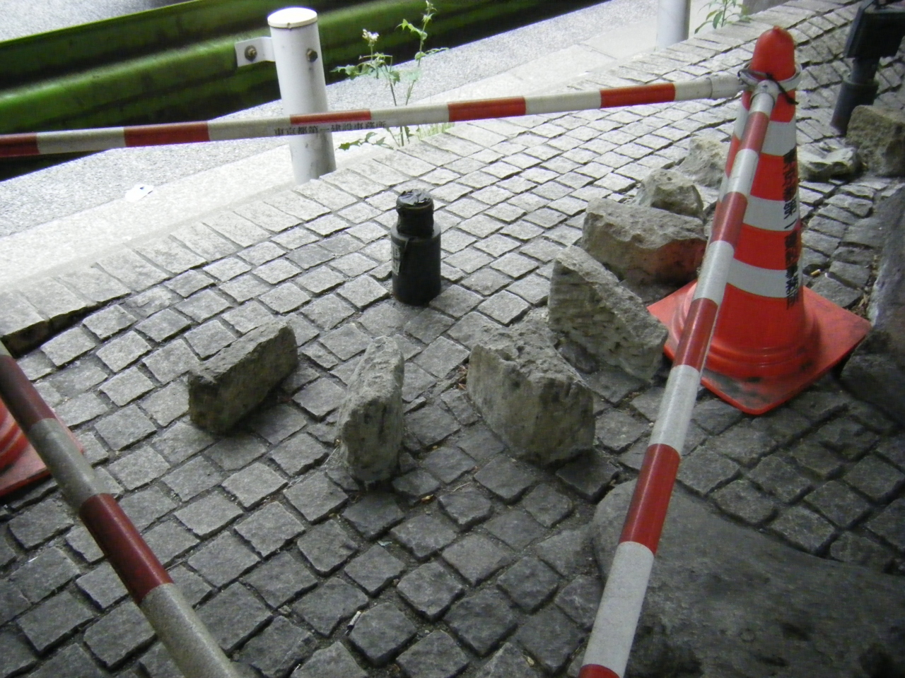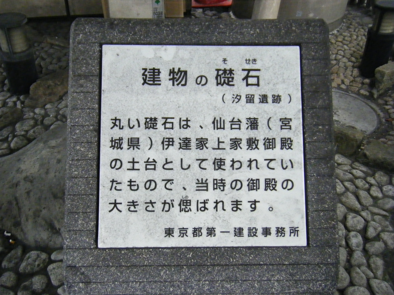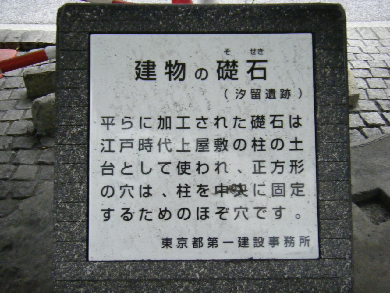 銀座東7丁目交差点の歩道橋下にいくつか史跡が残されていますが、そのうちの一つがこの「建物の礎石」になります。小さな石から大きな石まで、様々な形状の石が置かれていますが、これらの石は江戸時代の屋敷の土台として使われていた石だそうです。非常にきれいな形で正方形に掘られていたりして感心しました。