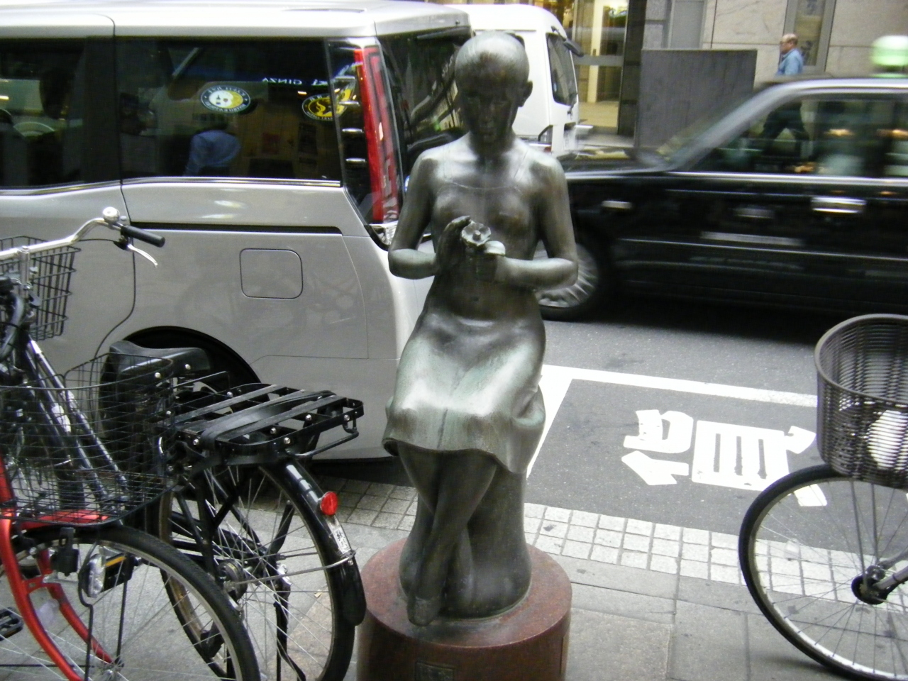 銀座の花椿通り沿いに、少女の像が置かれていますが、こちらの像が「はな」の像と呼ばれている彫刻になります。花椿通りは昭和の初めころ、出雲の国より贈られた椿の木が植えられたことから名づけられた通りで、その名前から椿の花をもった像「はなの像」が平成5年になって設置されたそうです。花椿通りという通りの名前にふさわしい可愛らしい女の子の像ですが、ちょっとインパクトには欠けるような気がしてしまいました。