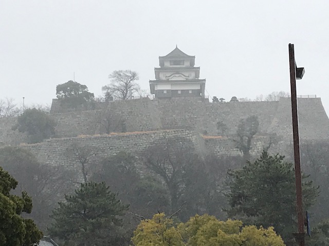 丸亀駅から歩いて10分ちょっとで丸亀城の大手門に到着しましたが、天守閣までには坂を登って行ってそれ以上の時間が必要でした。雨の日でしたが、駅の観光案内所で浜町商店街と丸亀通町商店街を通って行けば、アーケードなので濡れずに行けると聞いて楽しました。お城に近づくと、その石垣の高さに驚きました。高さは60メートルもあるそうで驚きです。このお城は天守閣よりも石垣が見ものです。