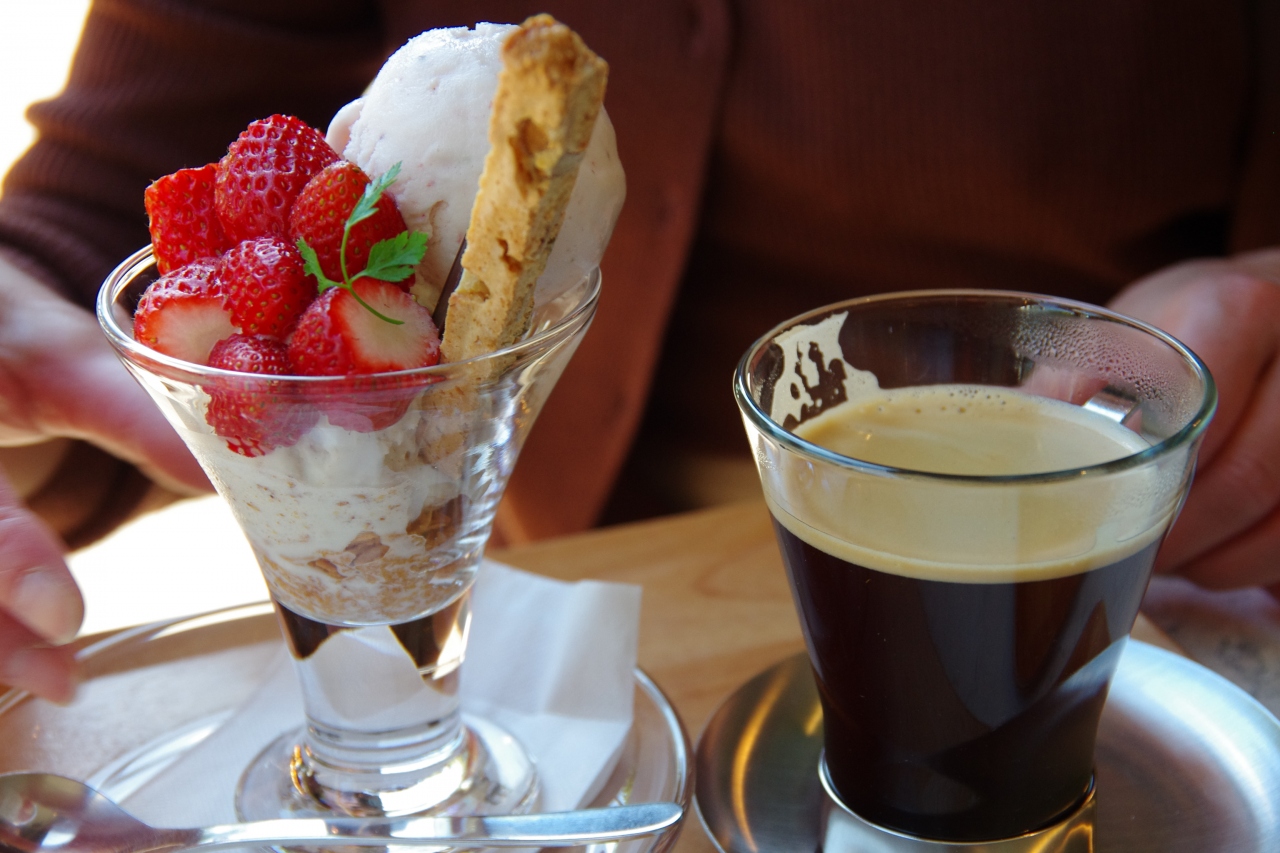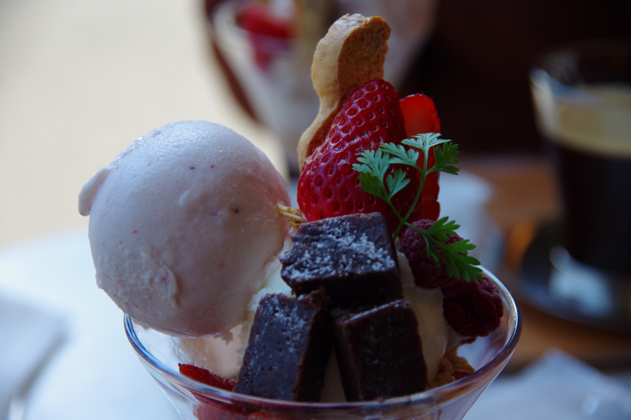 定番のジェラートはもちろん美味しく、季節限定?豪華なイチゴパフェも食べ応えあって楽しめます。窓からはすぐそこの太平洋が眺められます。