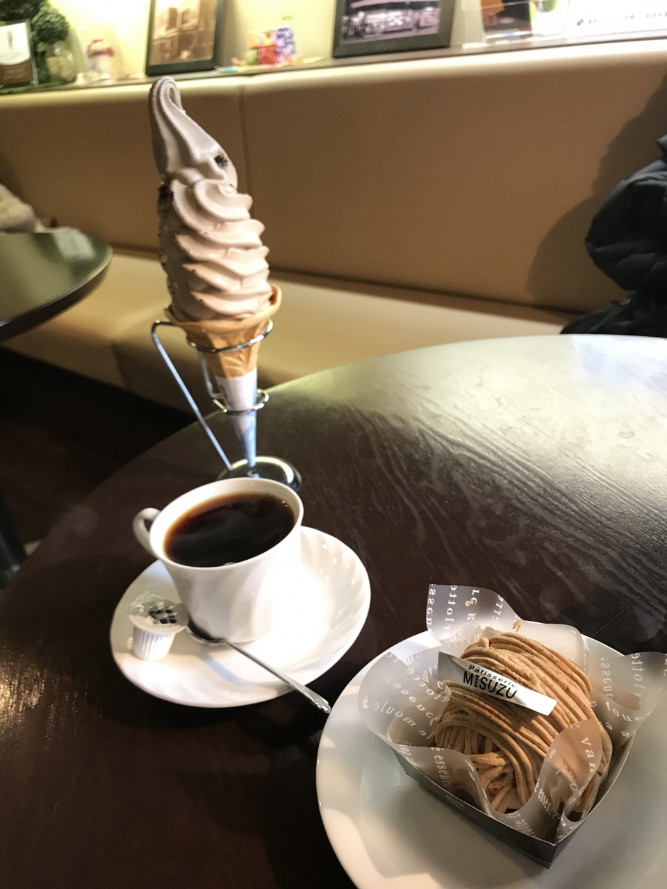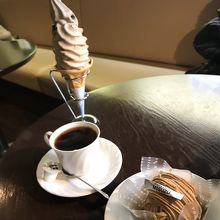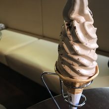 奥が喫茶スペースになっています。店内で、モカソフトとケーキセットをいただきました。コーヒーモンブランは、大門店限定でした。モカソフトは、なかなかのボリュームで、最後に珈琲粉末もかけてくれるので、しっかりと珈琲の味がしました。ソフトクリームは、持ち帰りだと少し安かったです。