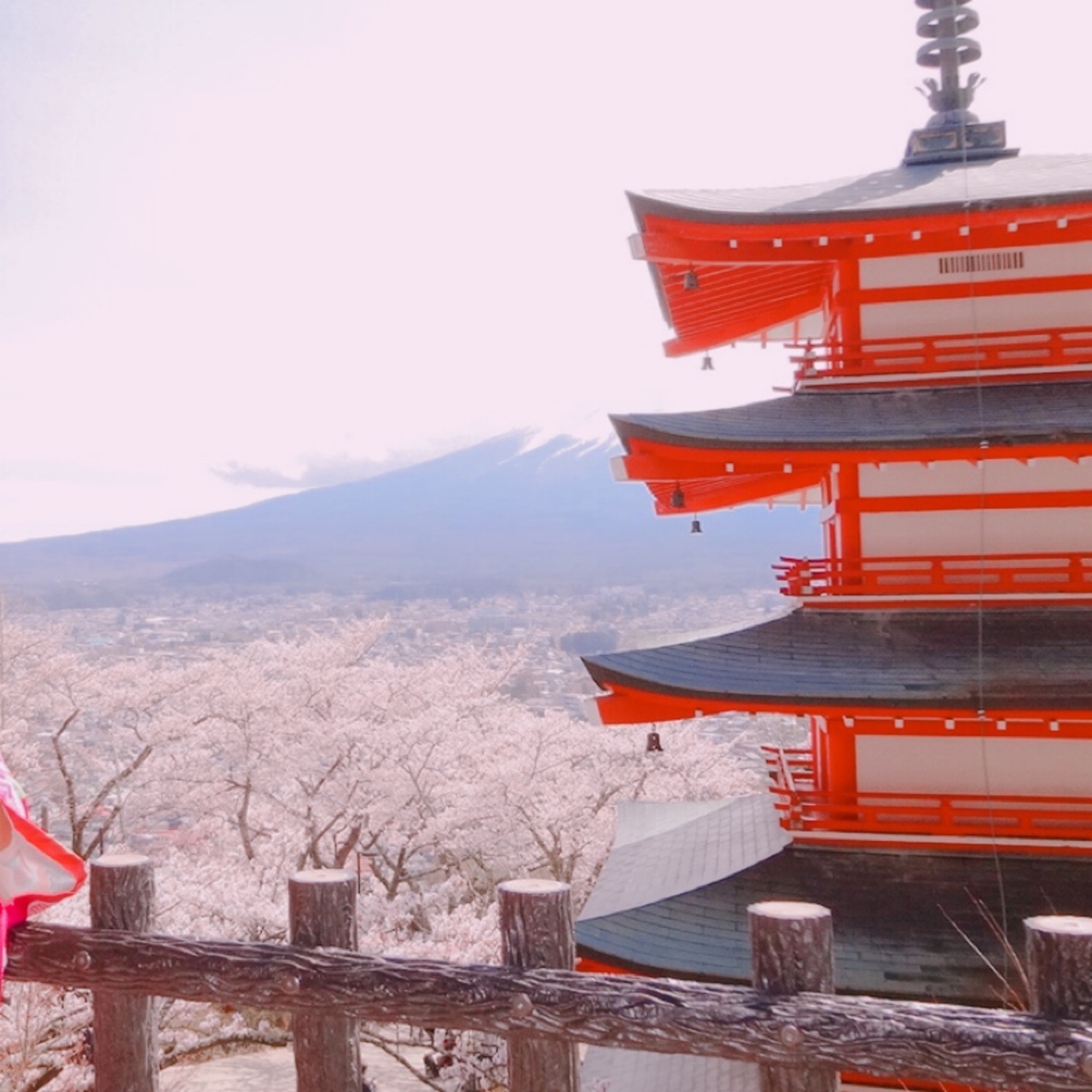 桜の時期なので混んでいました。日本らしい写真を撮りたかったので、河口湖にあるキモノキブンという所でレンタル着物を借りて行きました!案外着物でも階段は登れます。外国の方がたくさん声をかけてくれるので、ひたすら階段でしたが意外と頂上まではすぐ着きました。かなり目立ちますが、写真映え狙う方はおススメです!笑
