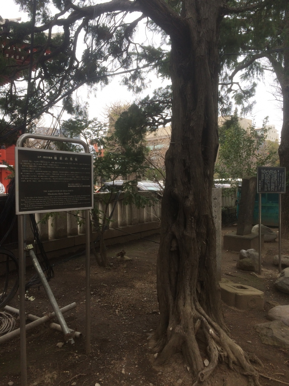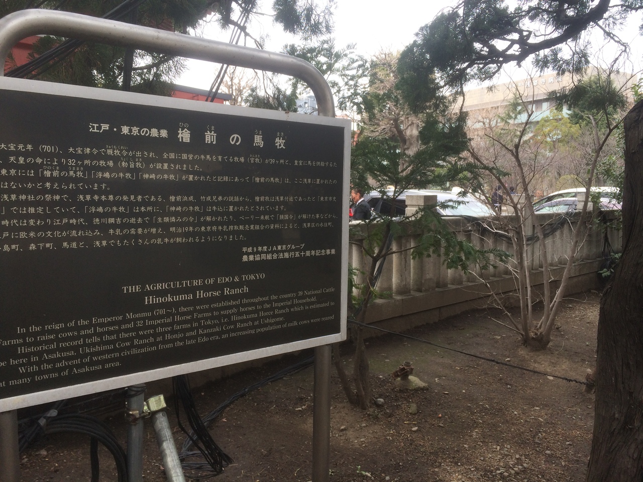 701年の大宝律令時に天皇が命令し、この付近に牧場があったのではないかということで、石碑があるのみで、牧場があったとは感じられない場所でした。今は石碑、看板、大きな細長い木があるだけで、この場所から浅草寺の本堂が見えます。