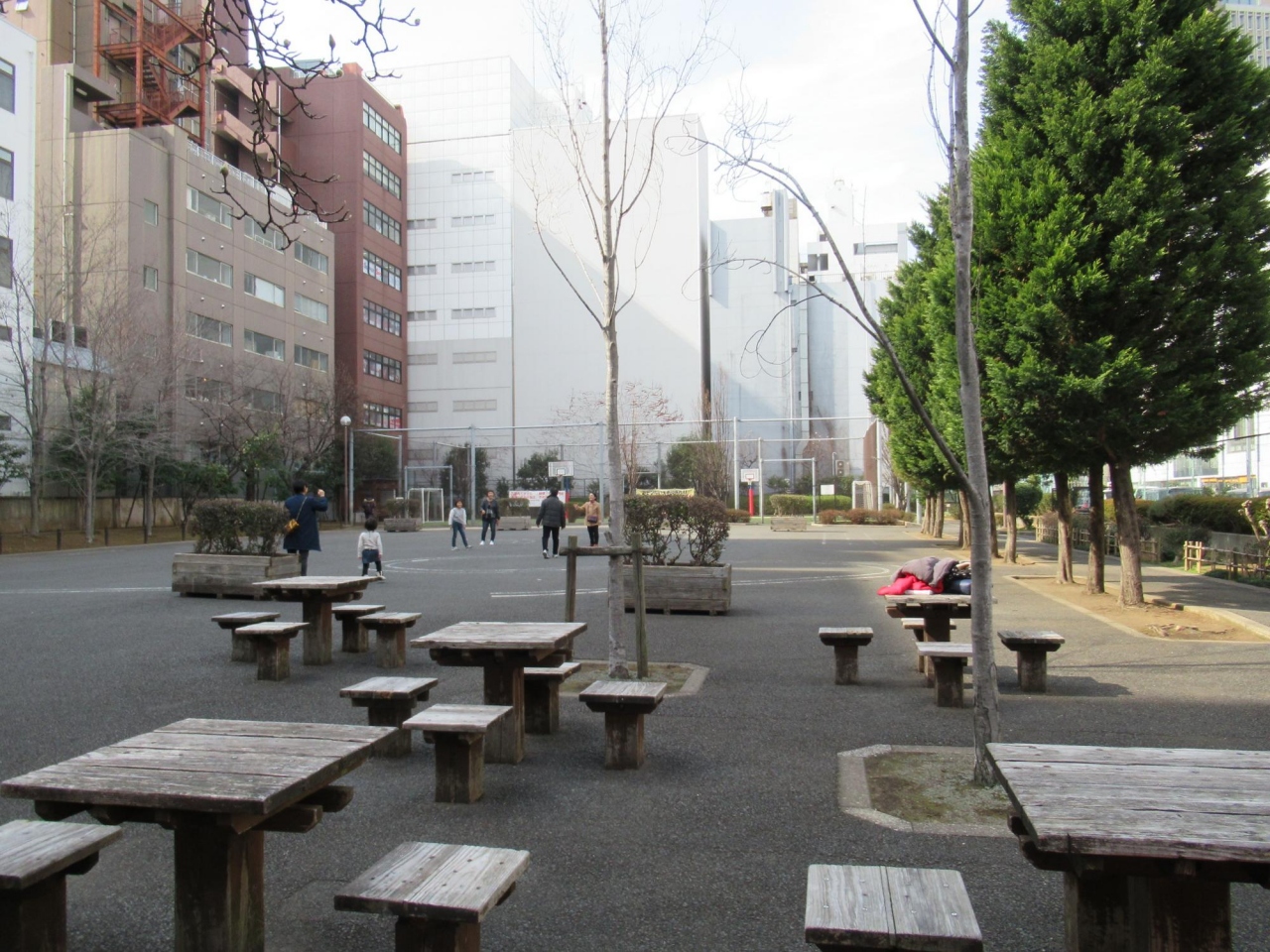 東側から入ると左手に、トイレと管理所の一寸した建物があり、正面奥にフットサルコートが、右手に木製の台と椅子がある位で、他にはこれと言ったものはない全くの広場なのでボール遊びなどに良いところでは と思ったところです。