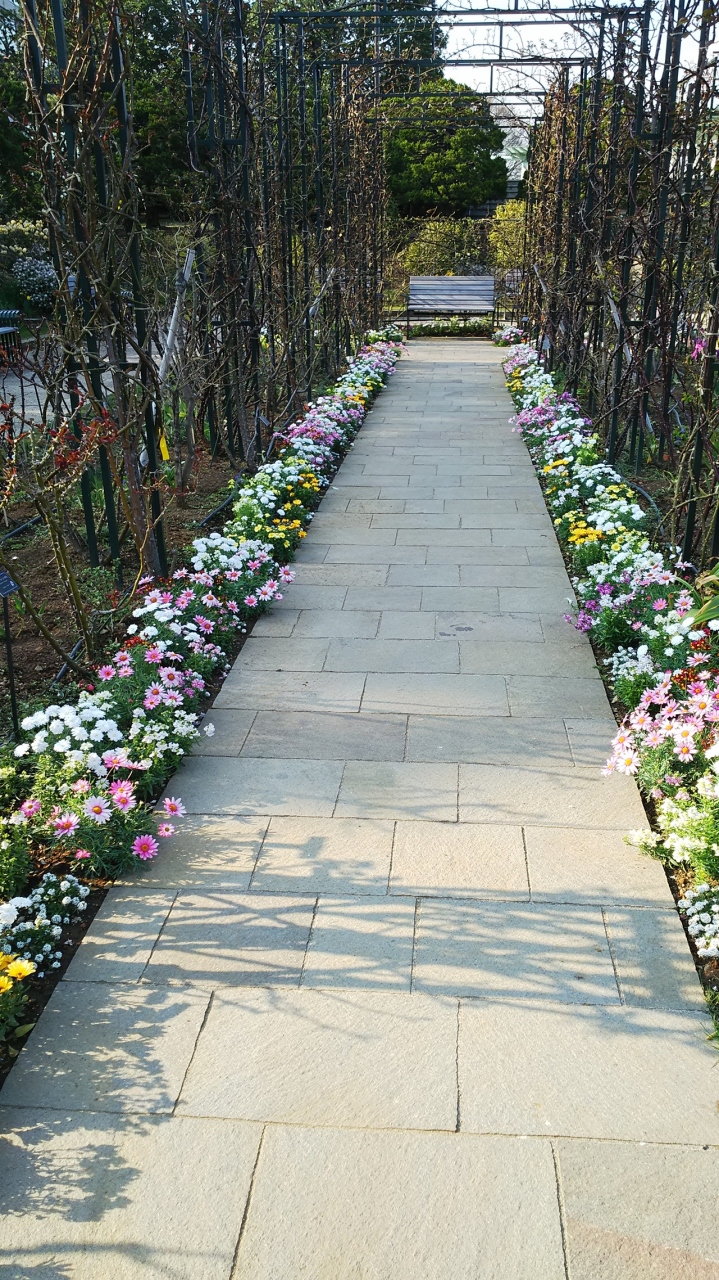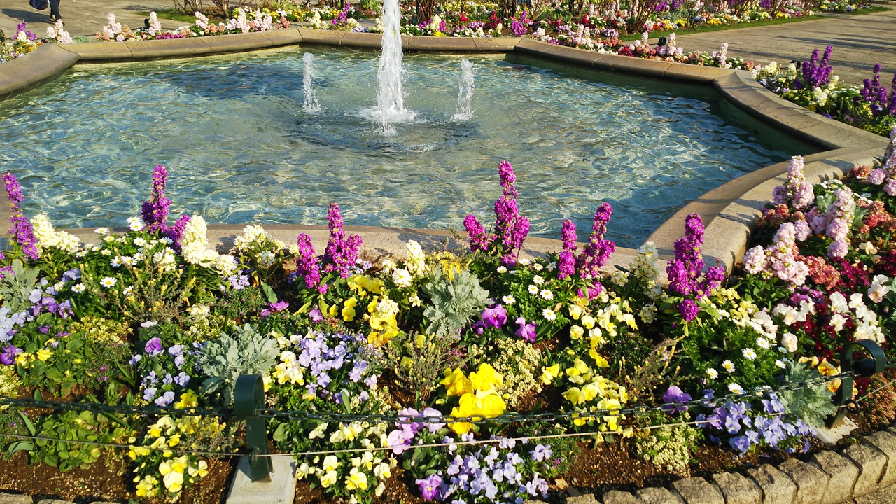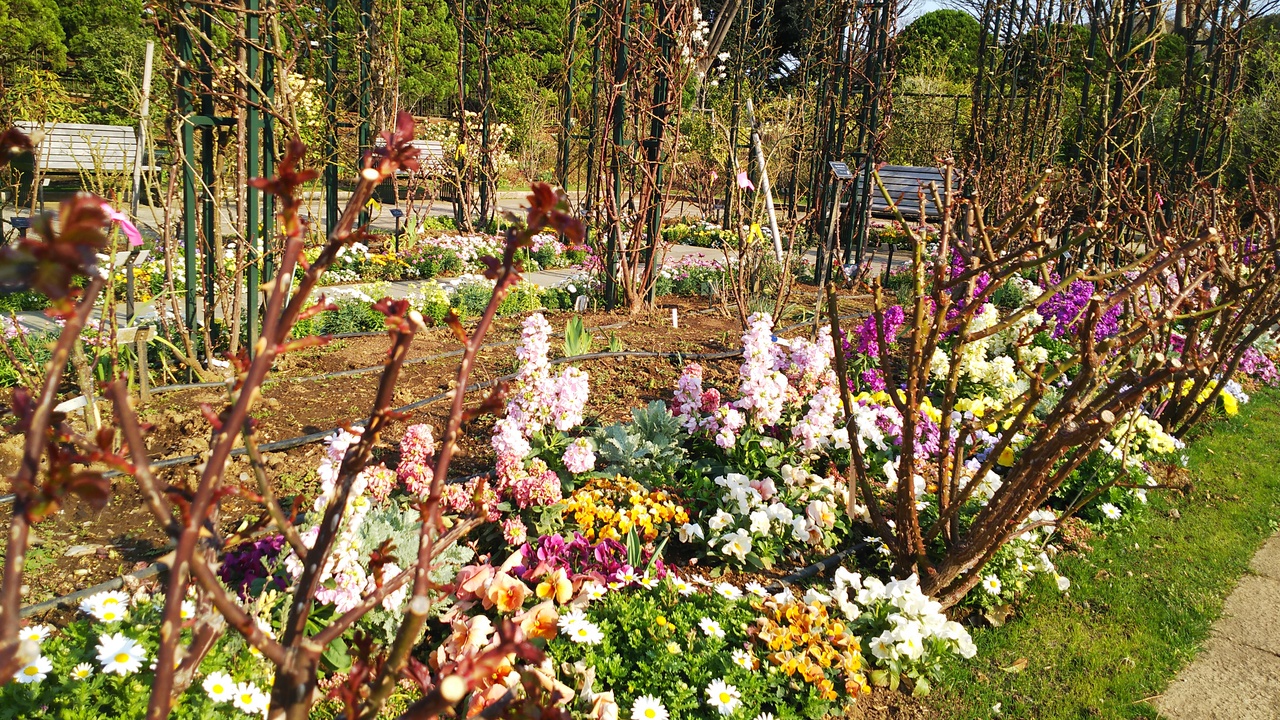 お花がたくさん咲いているガーデンがとてもきれいです。ベンチもあって、パンジー、ビオラ、金魚草などたくさんの花があり春のおとずれを感じられました。