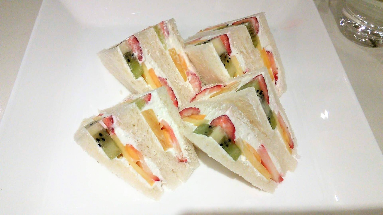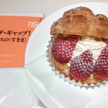 池袋でフルーツサンドイッチが食べたくなったら、西武デパート内の千疋屋総本店がおすすめです。いちごに、キウイフルーツ、パパイヤ、パイナップルの組み合わせで、フルーツのハーモニーが楽しめます。フルーツパーラー入口のショーウィンドーに並ぶ生ケーキは、メニューには載っていませんが、もちろん注文できます。今回は、苺のシュークリームを試しました。生クリームの下にはカスタードクリームも入っています。サンドイッチにもケーキにも、プラス300円でドリンクがセットできるので、意外にお得です。